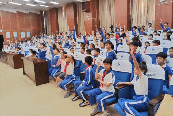 讲座现场,庄老师从深圳特色海洋生态、美丽的海底世界切入,用通俗易懂的语言讲解风暴潮、灾害性海浪、台风等海洋灾害的危害,详细介绍了海洋预报员的工作日常,让同学们明白海洋监测、预警与防范的重要性。互动问答环节中,“风暴潮预警分几级?”“灾害性海浪的有效波高是多少?”“遭遇离岸流该怎么办?”等问题引发同学们热烈抢答,同学们在趣味互动中快速掌握了实用的海洋防护技能。