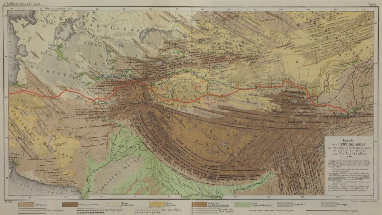图二:德国地理学家李希霍芬在他1876年绘制的《中亚地图》中,用明显的桔色标示出“丝绸之路”。