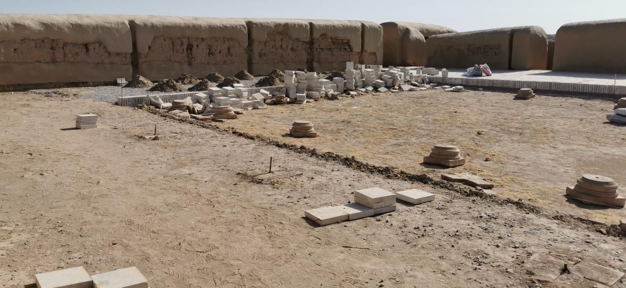 站在佛塔圆顶的台基上,可以看到它四周延伸出四个礼佛台,两翼还延伸出很多套院。贵霜王朝时,佛教已有了佛塔信仰与造塔传统。佛寺多以佛塔为中心,不像后来是以佛像大殿为中心。寺院原有许多僧房,现在都没了房顶,仅剩一面面土墙,整体看颇有迷宫的味道。这里正在修复寺院地面,四周有几个古柱础,可能是当年构架走廊凉棚的柱础(图二)。这种石柱础在今天的中亚庭院仍能见到。