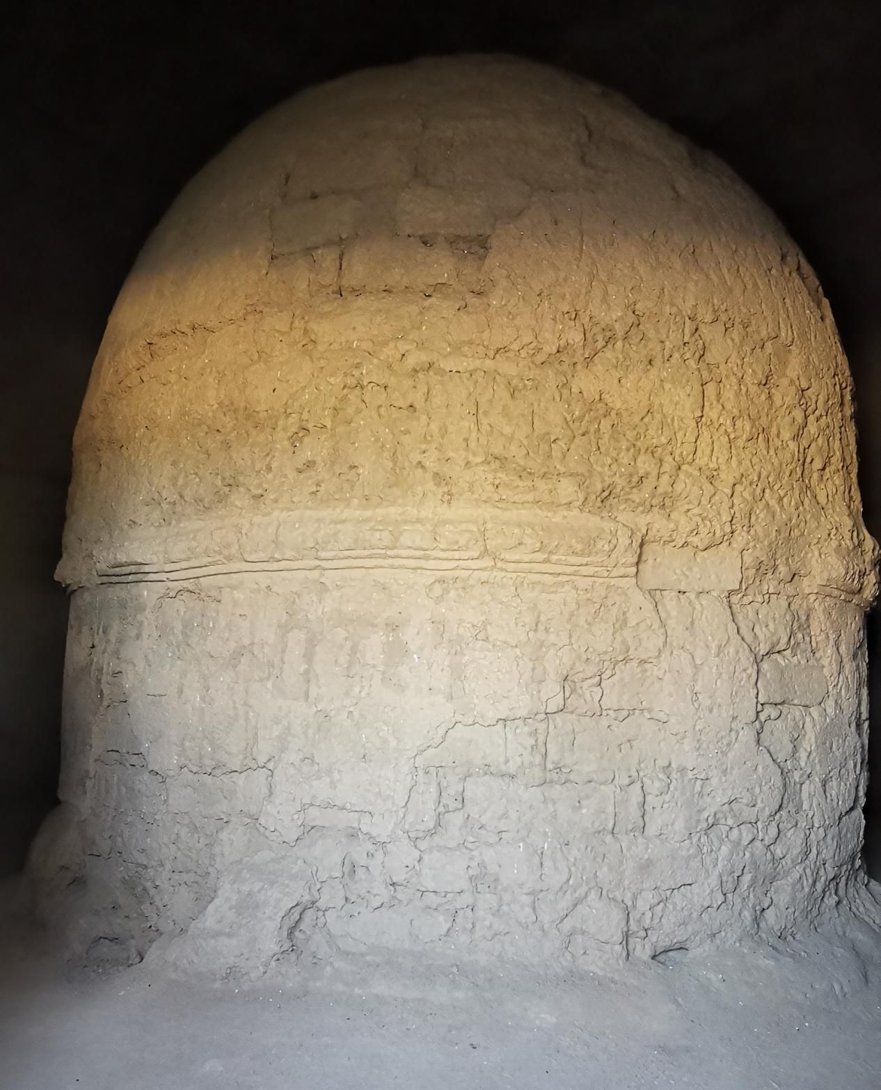 整个遗址最值得一看的,当然是那个圆顶里的佛塔。工作人员收了门票,就把圆顶建筑的小铁门打开。我爬了进去(图三),里面可以站起身来,可以绕着佛塔行走。这是泥砖堆砌的舍利塔,有一人多高。和我一起爬进去塔内的还有当地的两位文物保护工作者,一女一男。塔虽然有圆顶保护,不会被风吹雨淋了,但有一个东西,防不胜防,它就是白蚁。她们用手电筒仔细照塔身,许多蚁洞在强光下显形(图四)。