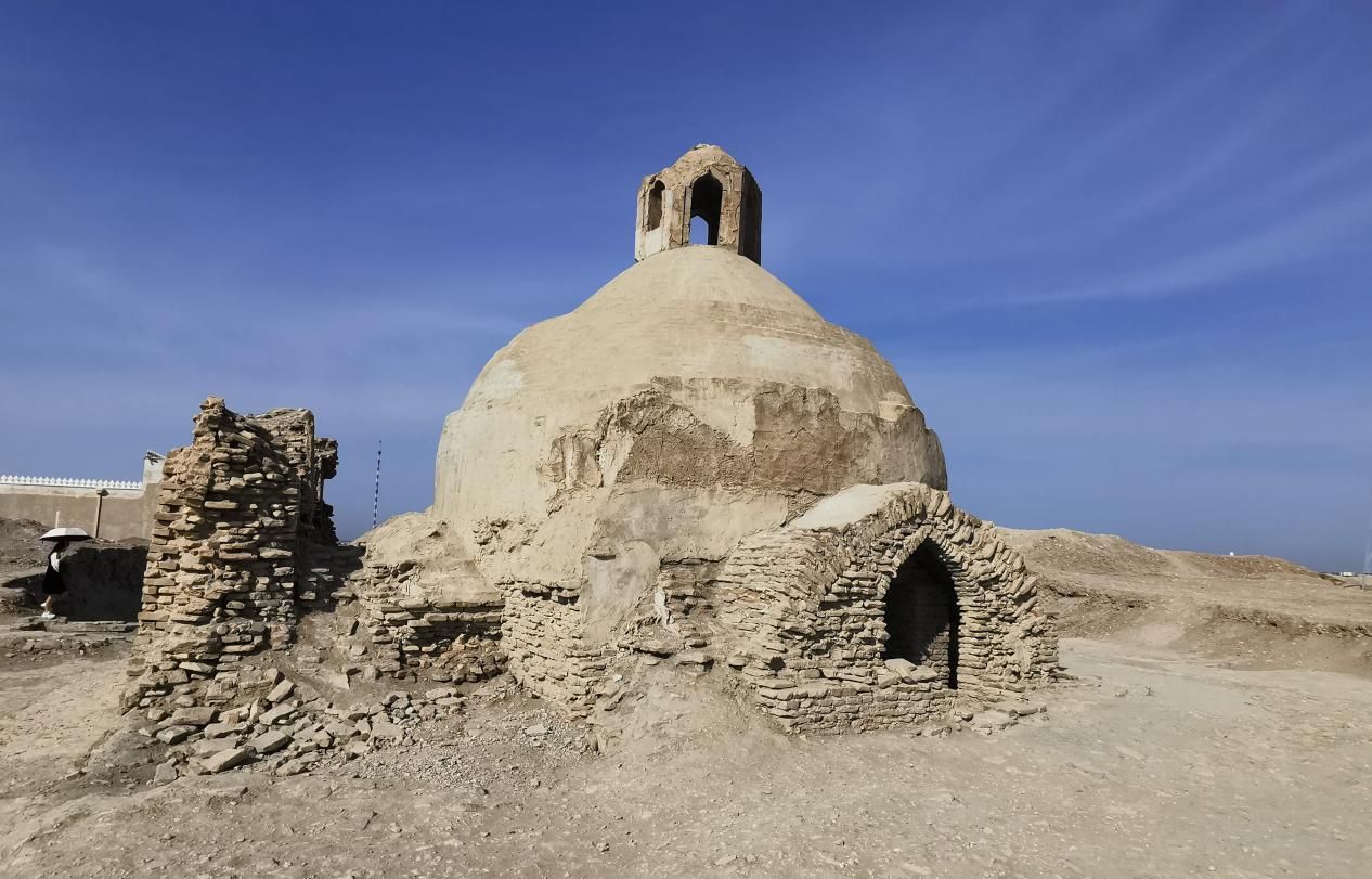 不过,战乱让我们失去了鲁达基歌唱过的布哈拉古城。现在人们见到的已是1220年被蒙古帝国征服后,又经过了帖木尔帝国重塑的古城。布哈拉城分为外城与内城,城西北角是住着王宫贵族的“布哈拉的紫禁城”——雅各城堡(图一)。布哈拉汗国经历的最后一次战火是1920年伏龙芝的苏联飞机和大炮的攻击。现在看到的雅各城堡城,除18世纪建造的圆柱形塔楼和拱形大门,其它墙体都是战争过后复建的,城内除了一座老清真寺残垣,一段断壁,百分之八十的建筑都已化为荒土(图二),除了18米高的城墙与门楼,这里已没什么可看的。