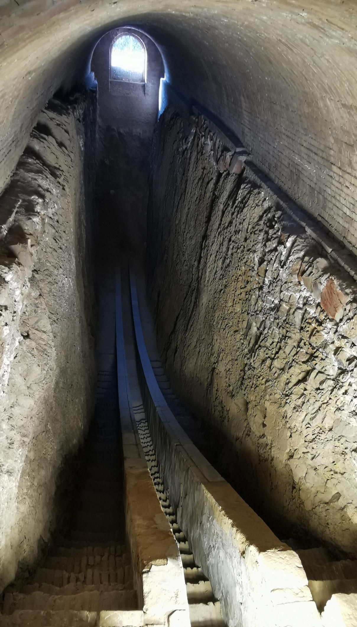 兀鲁伯在撒马尔汗建的天文台和马拉盖天文台一样,核心都是一台尺寸巨大的墙象限仪。我们在遗址能看到的只有残存的地下建筑:一个10多米深、2米宽的斜坑道,坑道里是并行的两条由大理石砌成的弧形轨道,其远端部分伸出对面的地表。它只是原来的墙象限仪的一半,地上的另一半毁坏了(图三)。