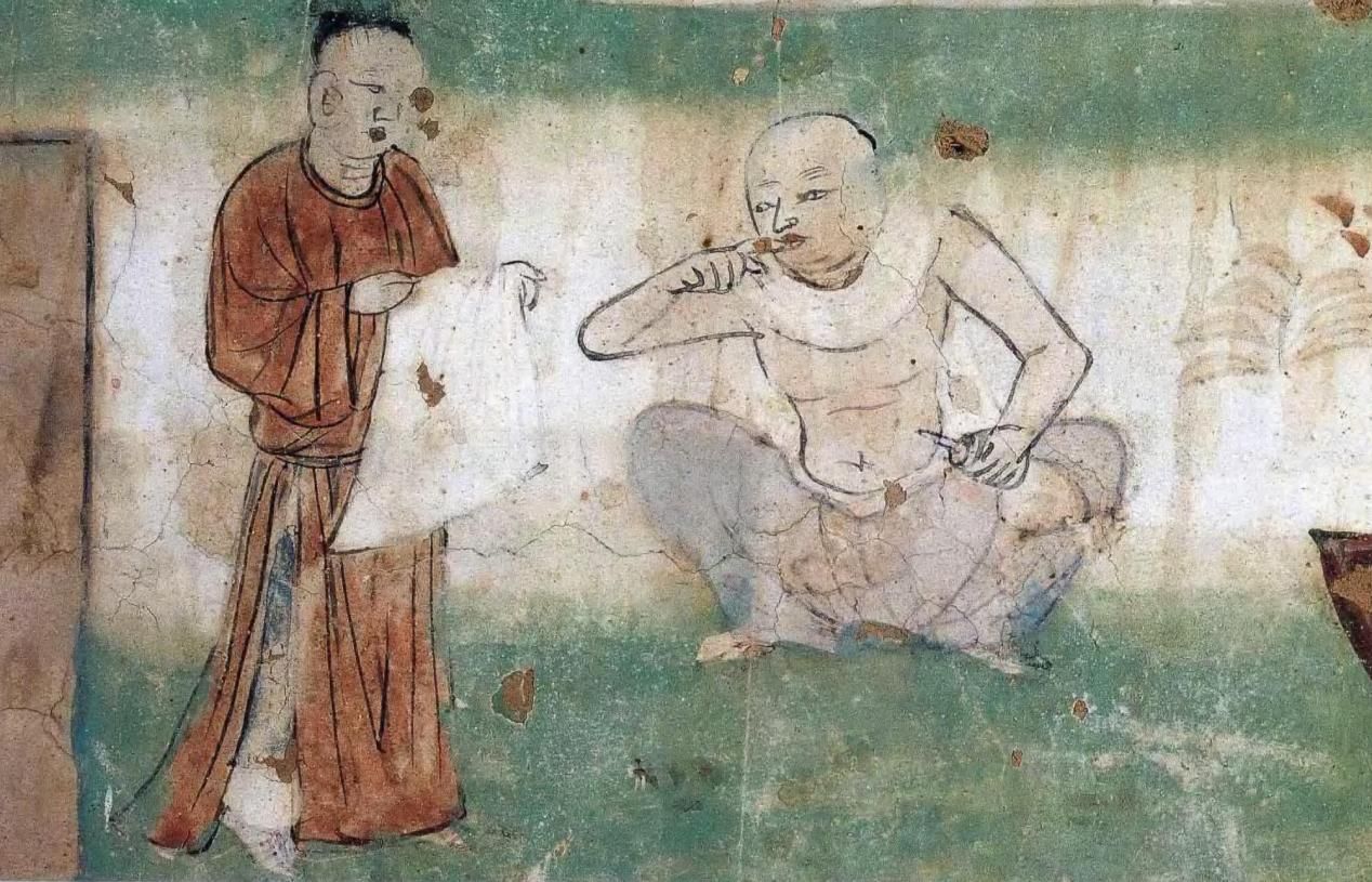 后来,沿着古人卫生的主题,我顺路学习了敦煌经变画中的“揩齿图”。据敦煌学研究者称,莫高窟第7、9、12、25、55、98、146、154、159、186、196、361、454窟及榆林窟第16窟等14个洞窟的弥勒经变画和劳度叉斗圣变画的壁画中,有12幅“揩齿图”,有2幅“齿木刷牙图”。其中,莫高窟第159窟中唐《弥勒经变》中的“剃度揩齿图”(剃度前必先洁齿,象征身心清净、断除尘垢。)描绘了僧人用杨柳枝洁齿的场景,被称为“中国最早的齿木刷牙图”(图二)。