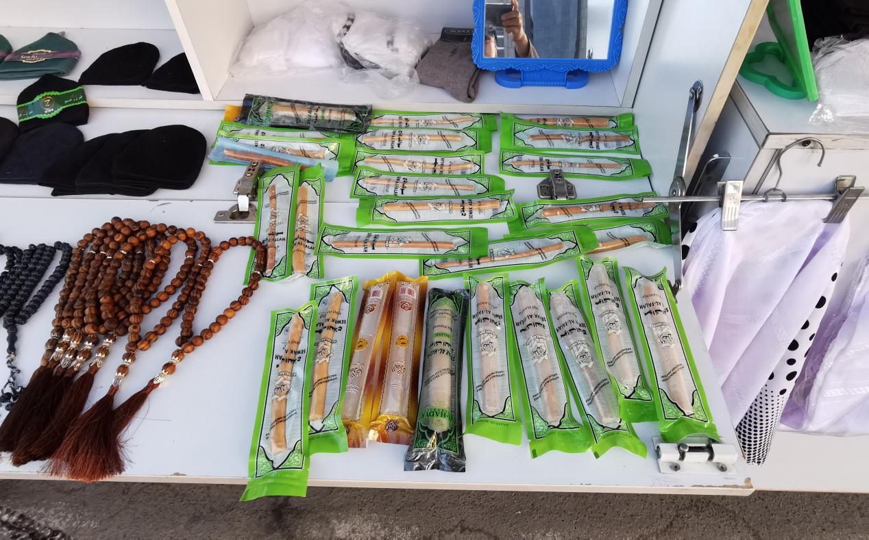 乌兹别克斯坦首都塔什干的白色清真寺又大又白,晃得我这双怕光的眼睛无处躲藏。于是就在长廊里散步,等着入寺内拍照的人出来。长廊里有一幅五个祈祷时间的大告示牌,牌子下边是一个卖杂货的小摊床,摆着33颗或99颗的多种念珠、帽子、旅游书籍,其中一种塑料包装里放着10公分长的小木棍,让我联想起20多年前的一项“研究”……