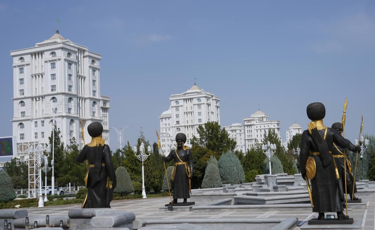 土库曼斯坦首都阿什哈巴德非常好看,当年经济特别好的时候全城建筑清一色采用白色大理石建造,不仅楼都是白的,路灯杆也是白的,公交车是白的,私家车也是白的……(图二),但是,若以景观而论,也没什么好看的。所以,为庆祝1998年全民通过中立政策而修建的中立门,也成为必看的景点之一。这个广场四周有总统行政楼、司法部、国防部等重要国家机关,中央有个高高的纪念碑,上面立有一个12米高的鎏金人像,他挥着的手能按照太阳的方向转动,永远指向太阳,那个金人就是土库曼斯坦独立建国后的首任总统尼亚佐夫。