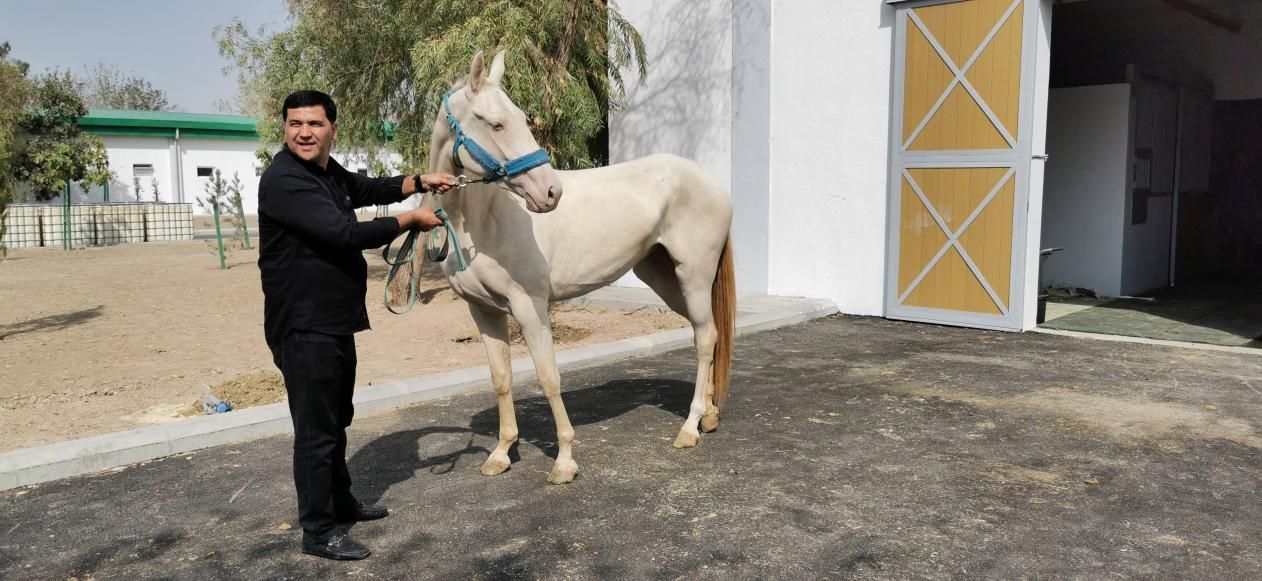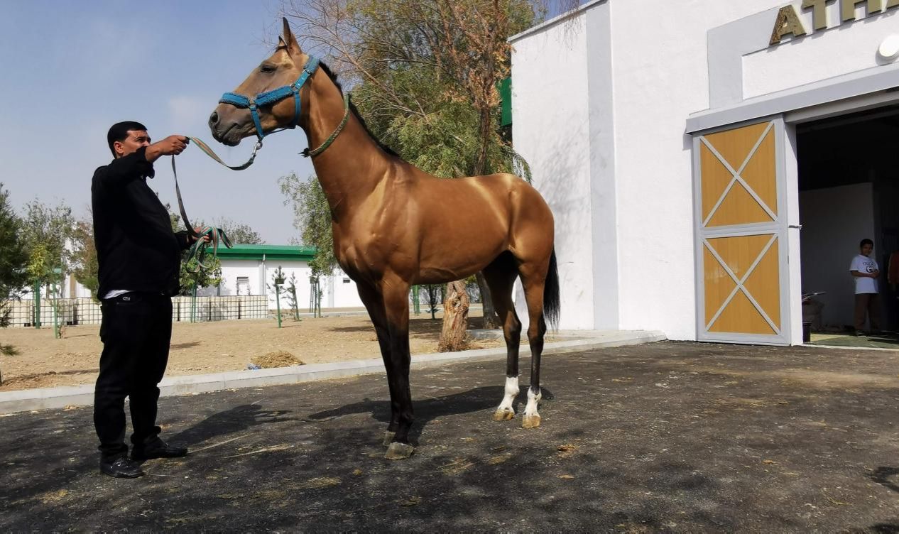 驯马师说,这种马的学名叫阿哈尔捷金马,原产地是土库曼斯坦科佩特山脉和卡拉库姆沙漠之间的阿哈尔绿洲,由捷金人部落培育出这种良马,所以叫“阿哈尔捷金马”。现在看到的阿哈尔捷金马,经过三千多年培育已成为世界上最古老的马种之一。这种马头细颈高,四肢修长,皮薄毛细,而且力量大、奔跑速度极快,1000米约1分7秒。作为土库曼斯坦的三大国宝(另两个是地毯、阿拉拜犬)之一,其形象绘制在国徽和货币上。阿哈尔捷金马被严格保护,每年出口量极少,不足50匹,每匹马的价值都超过百万。