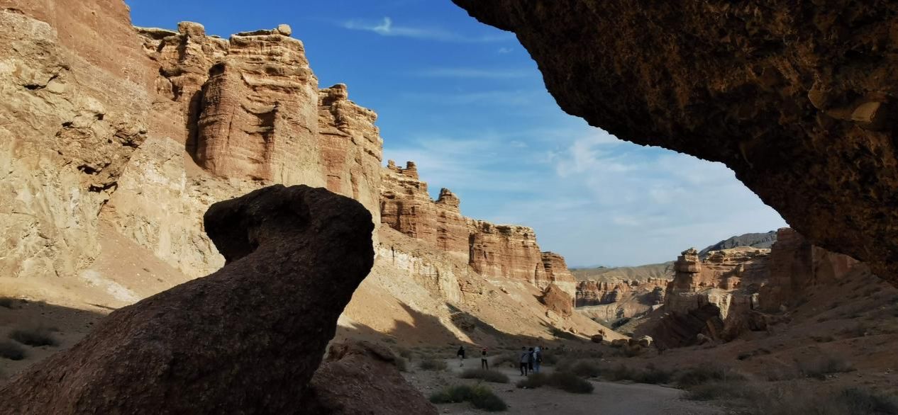 此外,城外200公里之外的恰伦峡谷还是很好看的,据说是世界上“第二大峡谷”,但是知道它的人少之又少。恰伦大峡谷像是在一马平川的草原上撕开的一道两公里长的裂缝,走到谷底,仰望着两旁红色岩石形成的峭壁,怪石嶙峋,却是拍照的好地方(图五)。